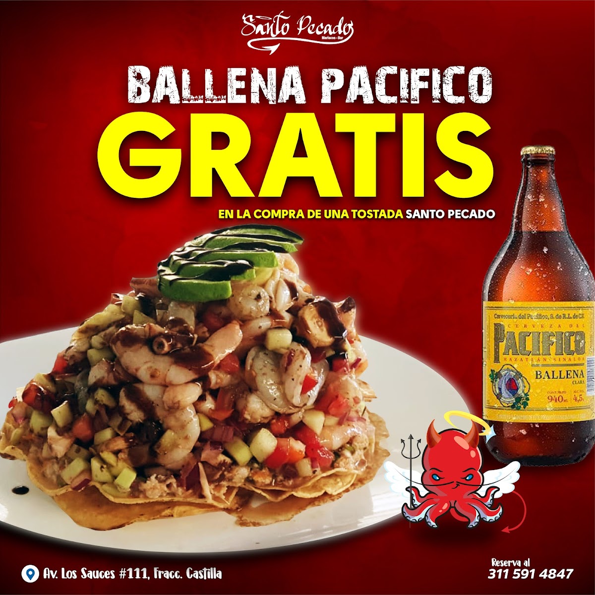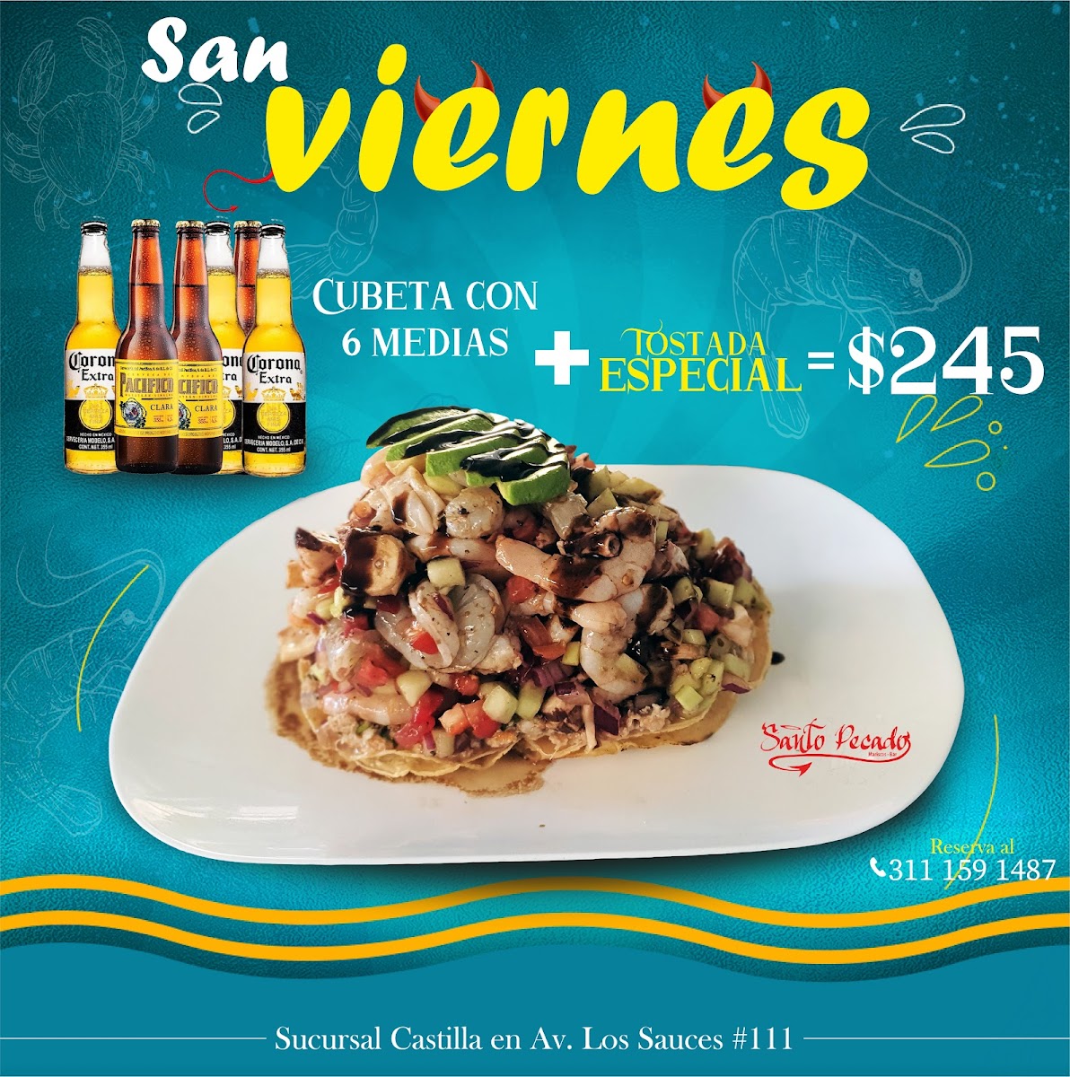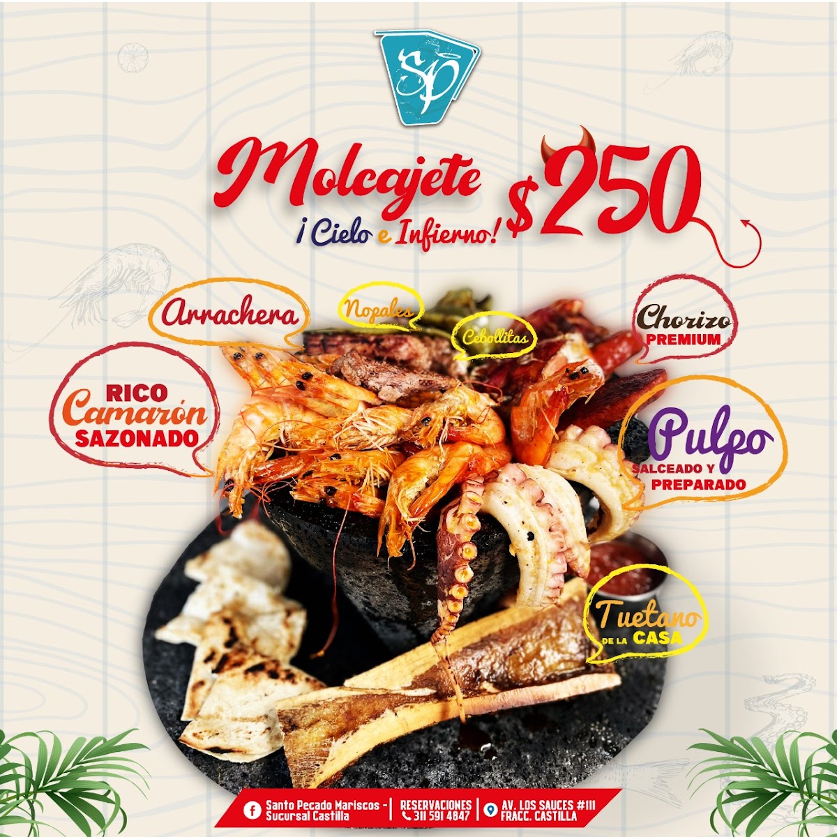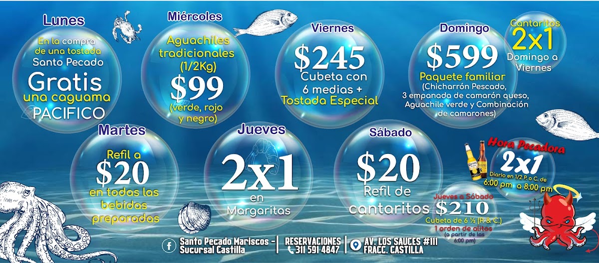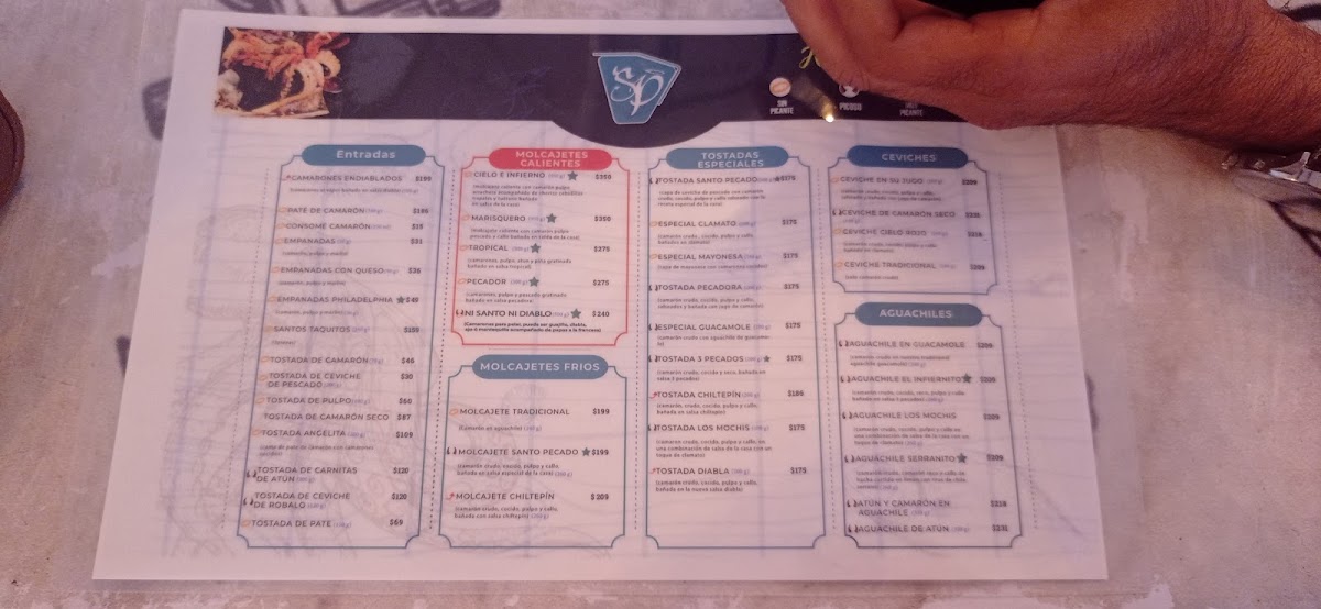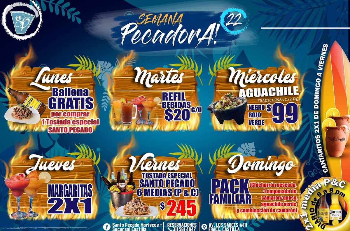 Santo Pecado Maríscos Bar presents a menu that feels cohesive and confident, clearly centered on fresh seafood, bold Mexican flavors, and shareable experiences. The variety of tostadas immediately stands out, especially the Tostada Santo Pecado, Tostadas, Tostada de Camarón, and Tostada de Chicharrón de Atún, each delivering a balance of crunch, acidity, and freshness that works perfectly as a starting point. For those who prefer something heartier, the molcajetes are the backbone of the menu: Molcajete Santo Pecado, Molcajete Marisquero, and Molcajete Cielo E Infierno arrive sizzling and generous, combining seafood and sauces in a way that feels indulgent yet well-structured. Traditional seafood cocktails and cold dishes like Campechana, Aguachile, and Caldito de Camarón highlight the kitchen’s respect for classic coastal recipes, while cooked dishes such as Camarones Empanizados, Shrimp In Tepic, Salmón A la Plancha, Empanada de Pulpo, and Pescado Empanizado Con Camarones Bañados En Salsa Agridulce Y Enchilado Medio show range and consistency in execution. Drinks are not an afterthought here; Margaritas, Michelada Marisquera, and Rica Michelada complement the food with bold, refreshing profiles that match the intensity of the dishes. Overall, the menu feels thoughtfully curated, offering enough variety to satisfy both casual diners and seafood enthusiasts while maintaining a clear identity rooted in mariscos, strong flavors, and generous portions.